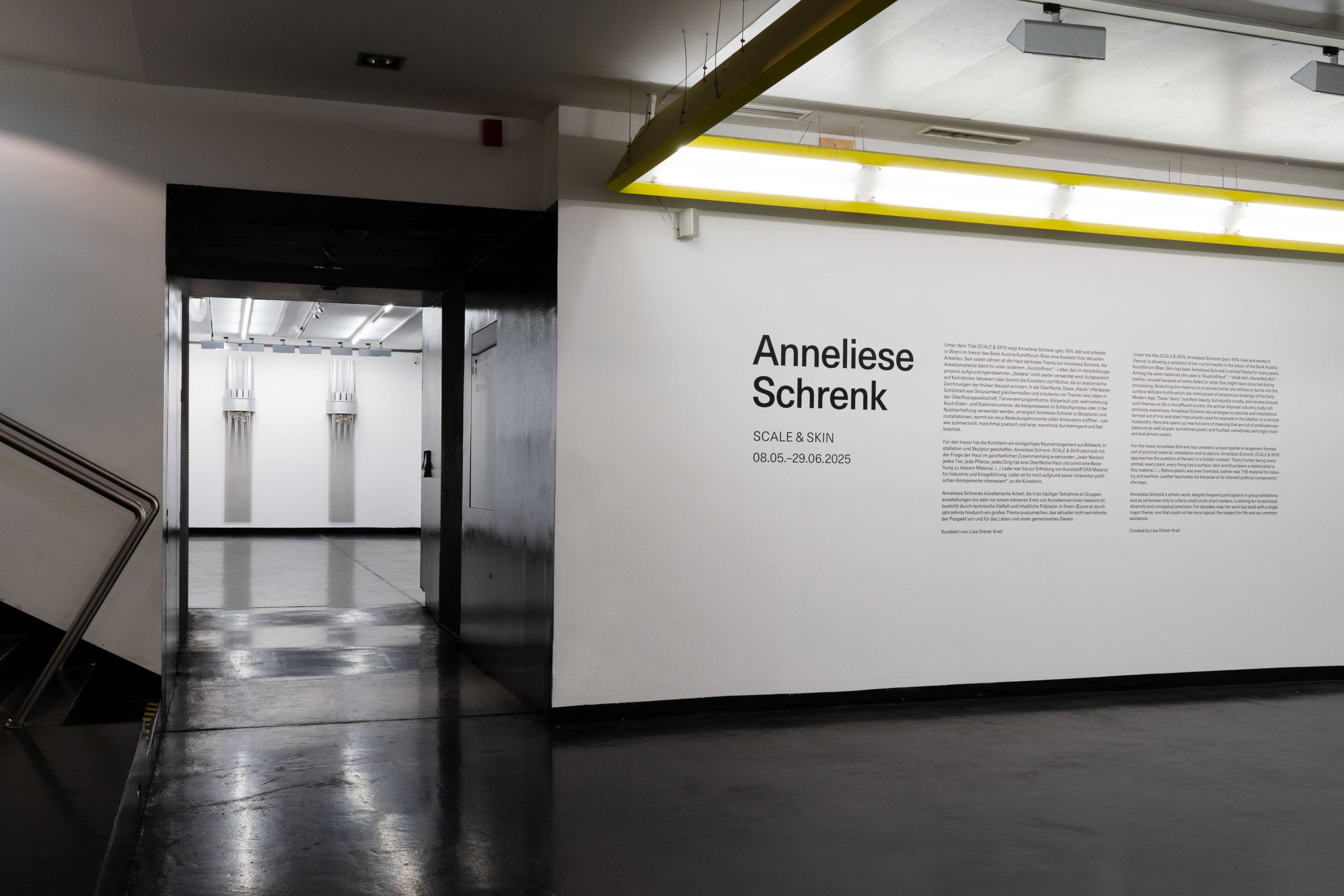 front: Raum. Ausstoßhäute mit Bezeichnungen aus der Lederindustrie - Vorbereitung Stanzung, "Männerstoffe" aus einer Konkursmasse, Metallgestänge, Weidezaundraht. 350x270x200 cm back: Marshallplan (maize gift), 2018. 200x200x200cm