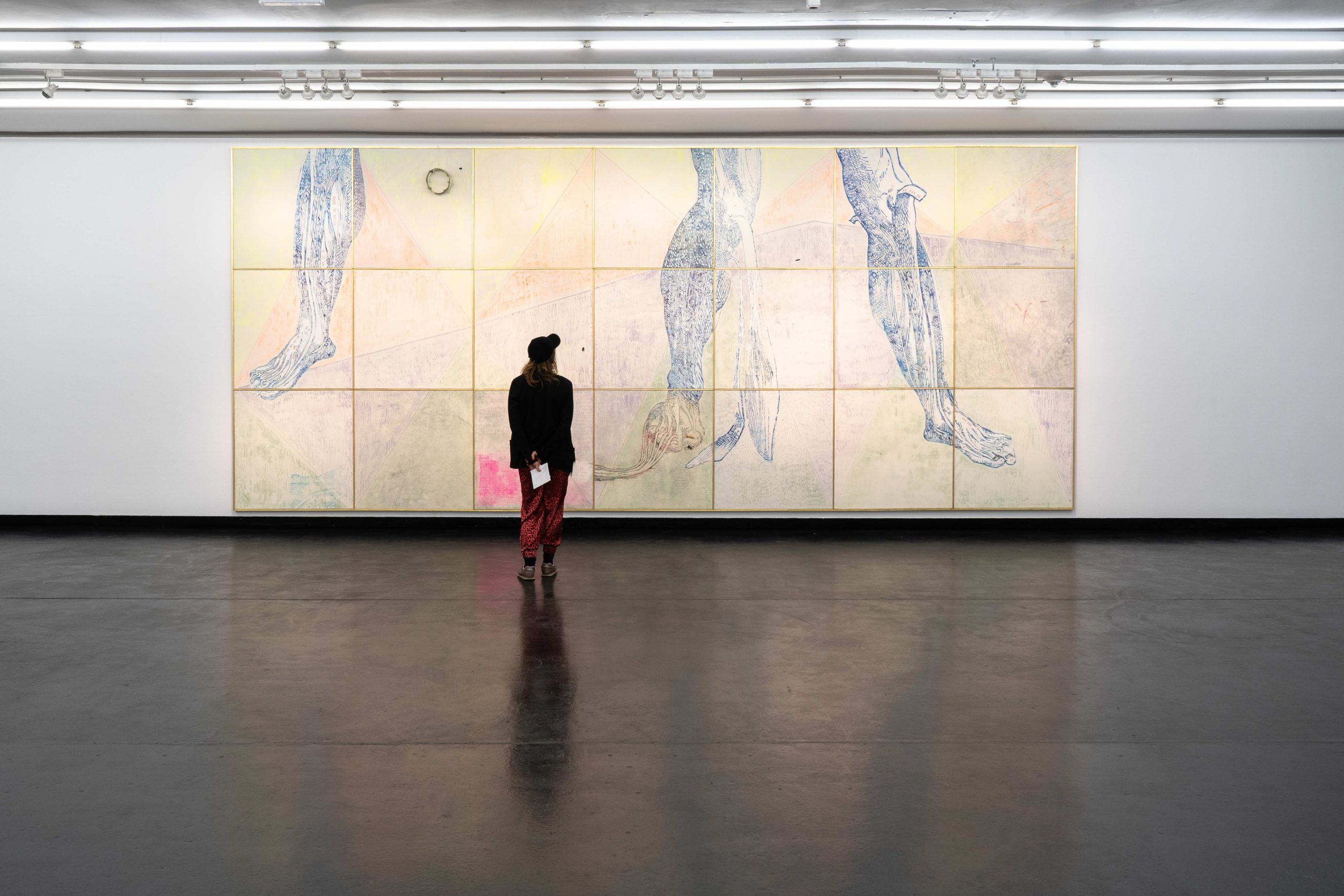 links: Körper brünett/rosé/blau/weiß/gepunktet. rechts: 2 in Rosa (Diptychon), 2015. Säure auf Leder, 160x340cm.