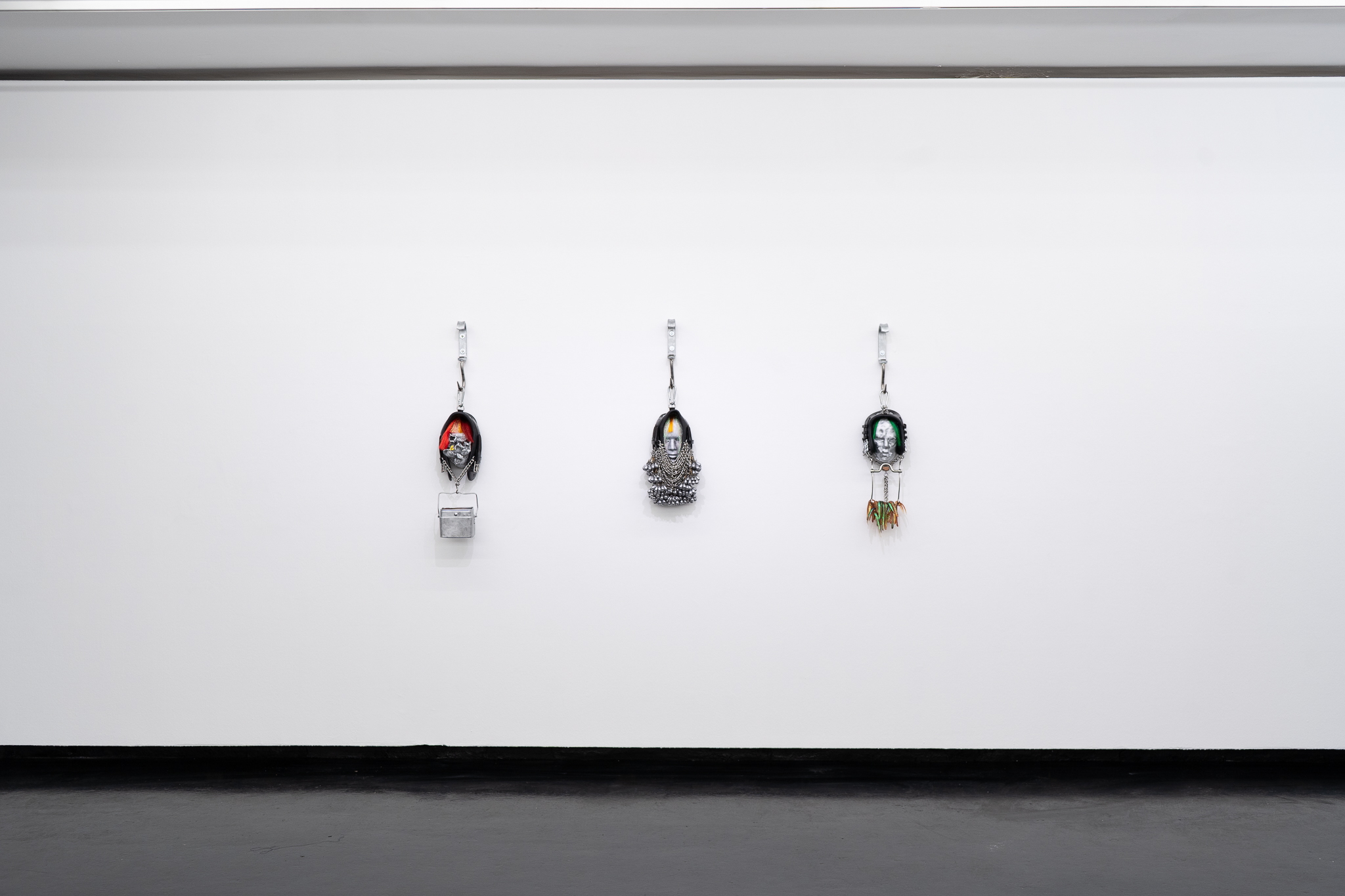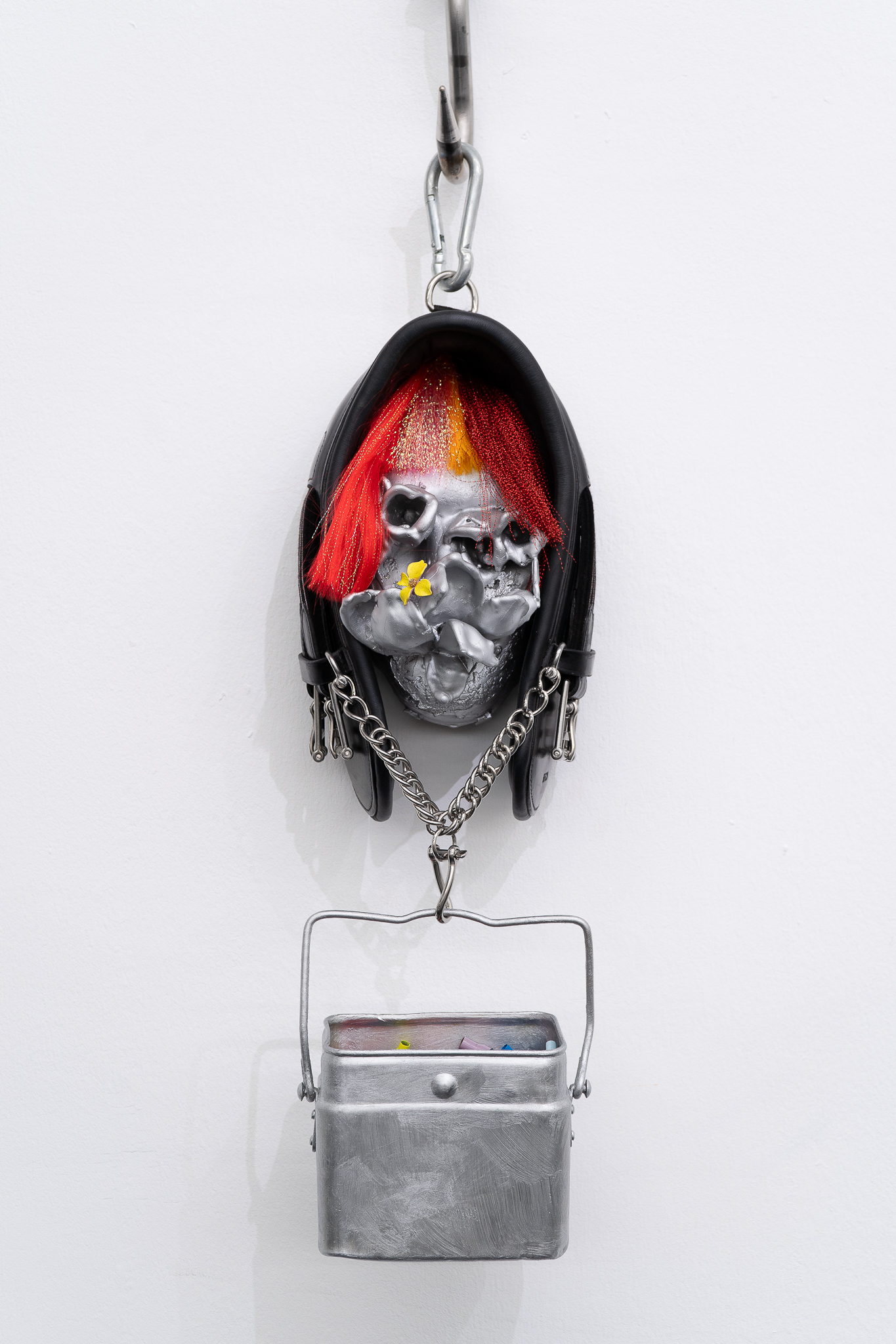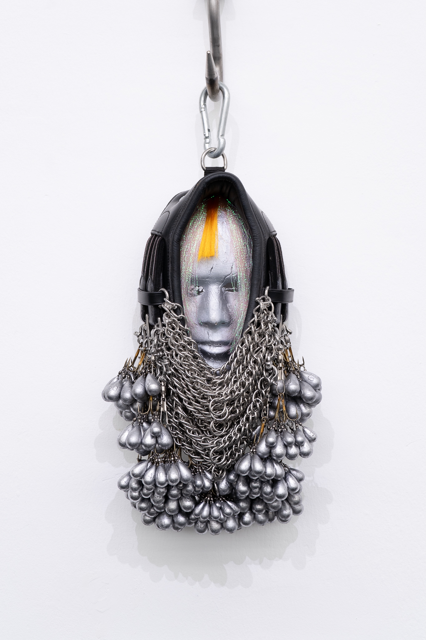 links: 3 Hüllen. Ausstoßhäute, Nägel. rechts: Körper brünett/rosé/blau/weiß/gepunktet, 2015. Leder